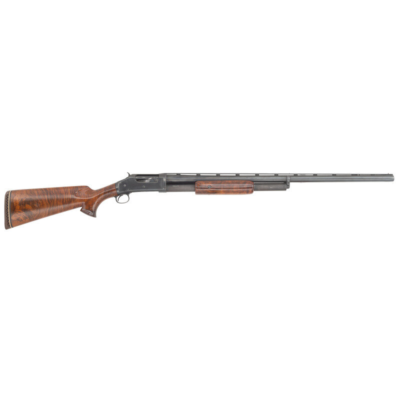 12 Gauge. 30" barrel length. SN: C95175. 2.75" chamber length. Full Choke. Blued metal refinish overall mounting polished feathered walnut semi-pistol grip stock with rosewood cap and white line spacer to Pachmayr recoil pad. Slide action repeating shotgun mounting a full length vented barrel rib featuring twin bead sights. Left rib shows SIMMONS GUN SPECIALTIES maker mark. Left action bar displays WINCHESTER/MODEL 1897 marking. {MODERN}