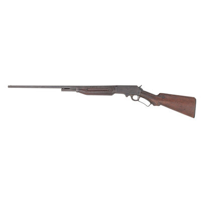 .410 Gauge. 26" barrel length. SN: U688. 2.5" chamber length. Modified choke. Blued metal finish overall mounting walnut semi-pistol grip stock and handguard with finger grooves. Lever action repeating shotgun fed by an internal half length tube magazine and mounting a front bead sight. Tang marked Marlin/410. {C&R}