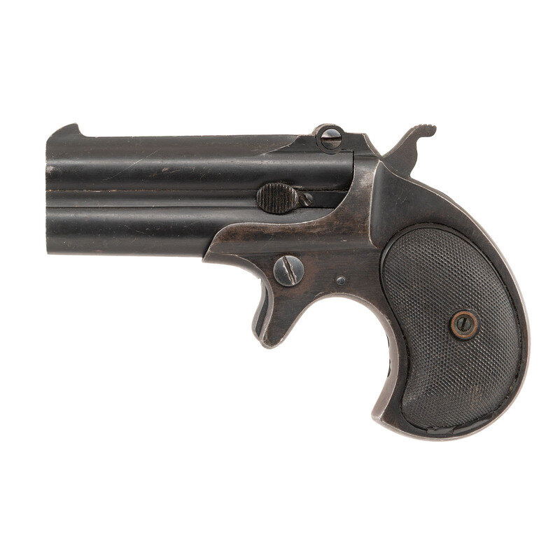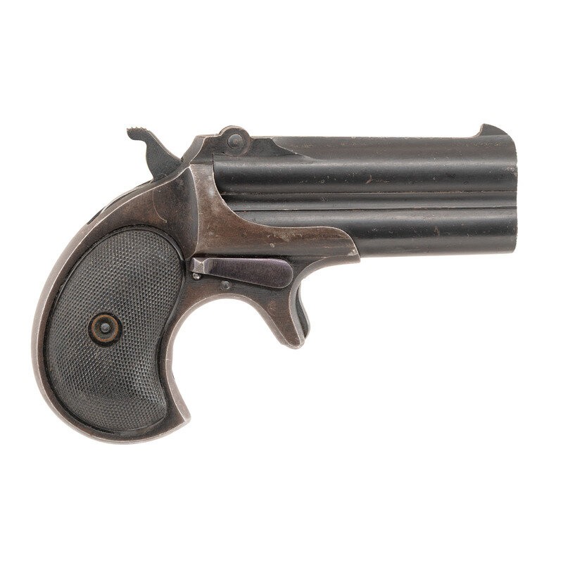 .41RF Short. 3" barrels. SN: L92903 (mfg. ca. 1912-1935). Blued finish, fire blued small parts, two-piece checkered hard rubber grips. Single action spur trigger tip up barrels over and under derringer pistol with manual extractor, hinge groove rear sight and integral blade front sight. One line barrel address reads REMINGTON ARMS-U.M.C.CO. ILION, N.Y.