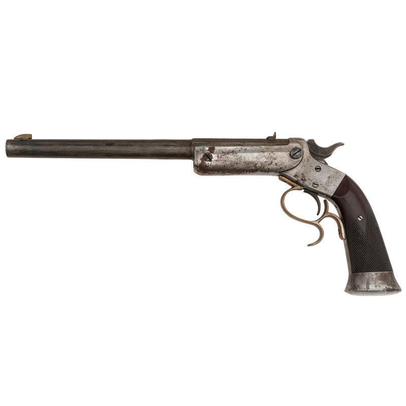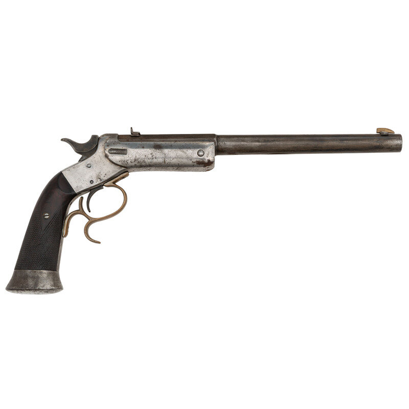 .22 LR. 10" barrel length. SN: 586. Blued barrel with nickel plated iron frame and brass triggerguard mounting checkered walnut grips and dovetailed rear notch and front blade sights. Single shot tip-up target pistol with extractor. Octagonal to round barrel marked on upper left flat J. STEVENS & CO. CHICOPEE FALLS. MASS. PAT. SEPT. 6. 1864. {ANTIQUE}