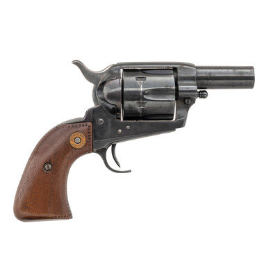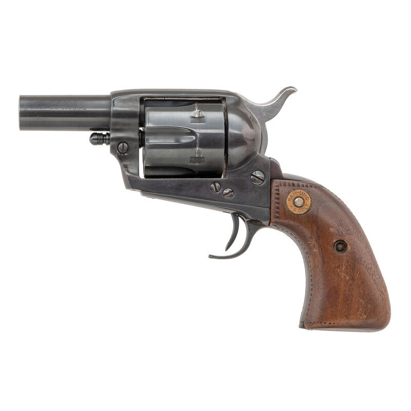 .44 Special (Marked on barrel. .45 Caliber Cylinder). 2.5" barrel length. SN: 176902. Blued metal refinish with polished hammer mounting sanded two piece wood grips with REM-UMC/45 COLT medallions in both panels. Single action six-shot hand ejector revolver with the barrel cut down obscuring most of the address and model marks, and mounting no front sight. Forward triggerguard has been cut off and polished in the fashion of a Fitz Special. Hammer lacks firing pin. Note: while the serial number corresponds to an 1898 date of production, according to ATF requirements, these modifications to the configuration render it an FFL item.
