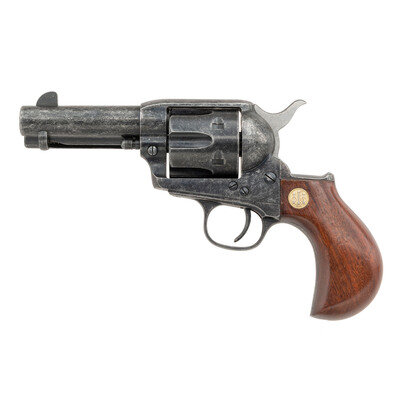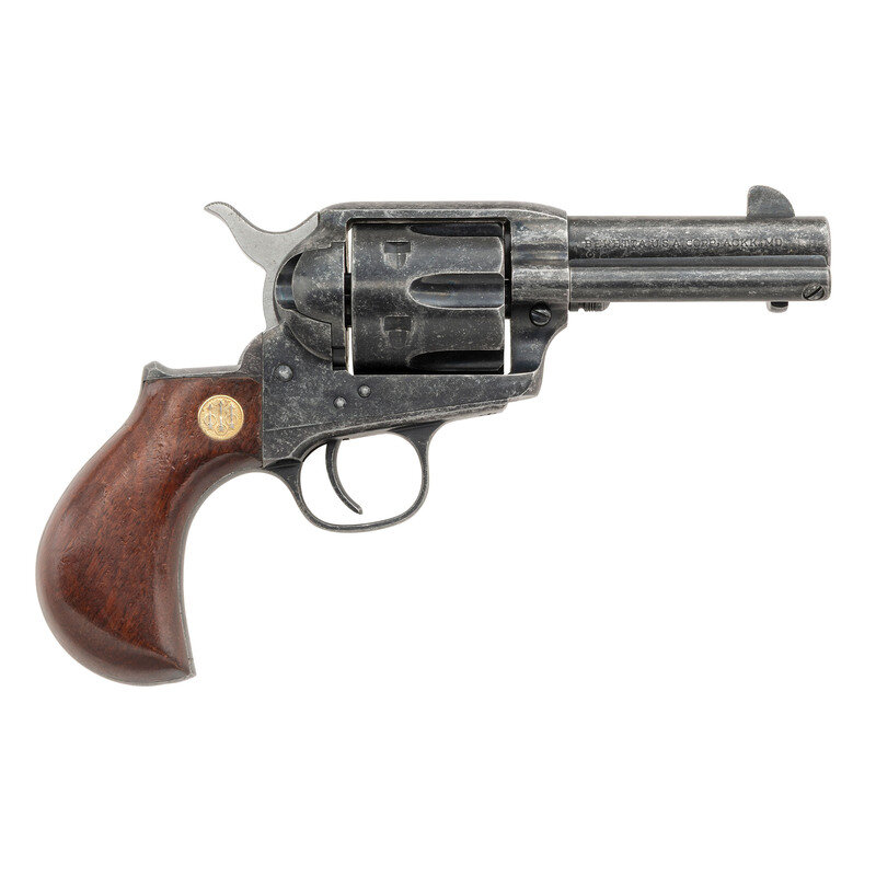 .45 Long Colt. 3.5" blade length. SN: B25884. Artificially aged blued metal finish with polished hammer flanks mounting varnished walnut birdshead grips with Beretta medallions. Single action six-shot loading gate revolver with spring loaded ejector rod and mounting fixed front blade and topstrap notch sights. Standard make and model markings including Italian firing proofs. {MODERN}