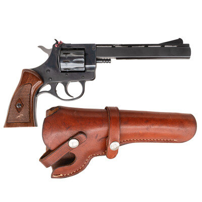 .22 LR. 6" barrel length. SN: AM31320. Blued metal finish with polished hammer mounting walnut left hand thumb rest grips and adjustable rear notch and front blade sights on a matted vented barrel rib. Double action nine-shot hand ejector revolver with transfer bar safety mechanism. Standard make and model markings include H&R INC. GARDNER, MASS. U.S.A. to left frame. Comes with a leather holster made by VIKING. {MODERN}