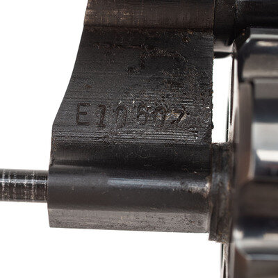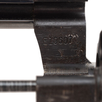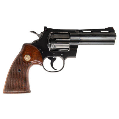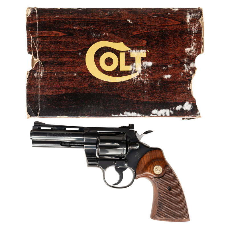 .357 Magnum. 4" barrel length. SN: E10607. Blued metal finish with polished hammer flanks mounting checkered walnut Colt medallion grips and adjustable target rear notch and front ramp sights on a full length vented barrel rib. Double action six-shot hand ejector revolver featuring full length underlug and shrouded ejector rod. Standard make and model markings including single line address to the right barrel. Serial number corresponds to 1970 production. Front sight has been touched up with red enamel paint. Comes with original wood grain COLT marked cardboard box with steyrofoam liner, owner's manual, and a copy of "the Colt Companion". {C&R}