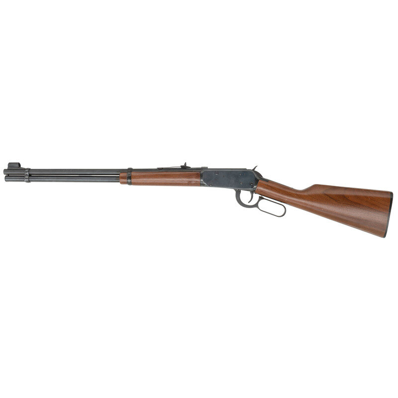 30-30 Win. 20" barrel length. SN: 4155186. Blued frame and barrel with wood stock and foregrip. Lever action repeating rifle with full-length tube magazine. Rear sight is semi buckhorn paired with a beaded front sight. {C&R}