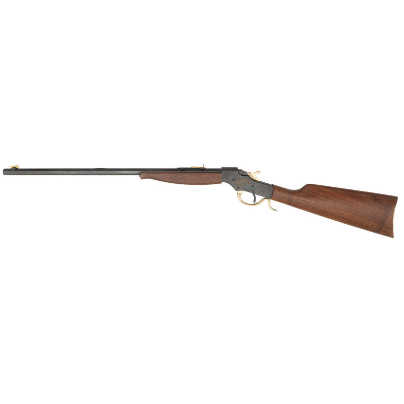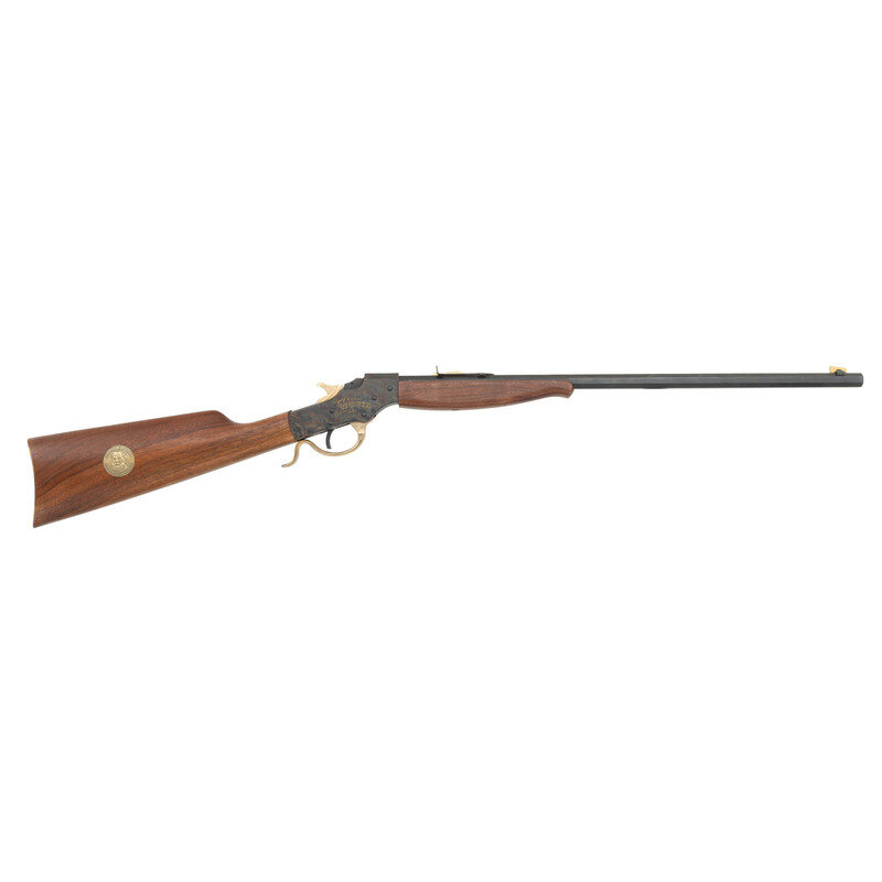 .22 S/L/LR. 20.5" barrel length. Falling block action. SN: 05218SF. Case hardened frame with blued barrel and wood foregrip and stock. Single-shot falling block rifle mounting adjustable tangent rear notch and front gold blade sights. Falling block and hammer have gold finish. Stevens Favorite engraved on both flanks of the frame with gold finish. Stock fitted with a gold medallion featuring a portrait of Joshua Stevens on right side. {C&R}