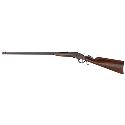 .25 Stevens. 24" barrel length. SN: Q572. Blued metal finish with casehardened frame mounting varnished walnut straight wrist stock with black synthetic buttplate showing STEVENS banner. Single shot falling block target rifle mounting German Silver front blade, adjustable rear notch, and a folding tang sight. Standard make and model markings including 25-STEVENS to left barrel and J. STEVENS ARMS & TOOL CO./CHICOPEE FALLS MASS U.S.A. {C&R}