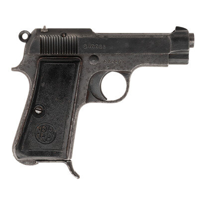 .32 ACP. 3.5" barrel length. SN: 570083. Phosphate metal finish with matted black plastic PB logo grips and mounting standard military pattern sights. Single action simple-blowback operated autoloading pistol fed by detachable single stack magazines. Left slide struck P. BERETTA-CAL. 7.65-BREVETTATA/GARDONE V.T. 1944, with the entire handgun showing the rough machining indicative of late war manufacture. Left frame shows the circled 4/UT stamp indicative of German contract manufacture. Comes with one magazine. {C&R}