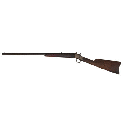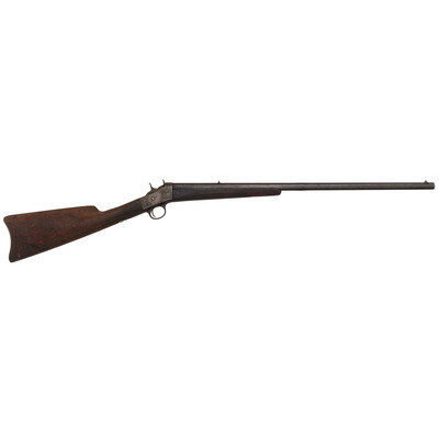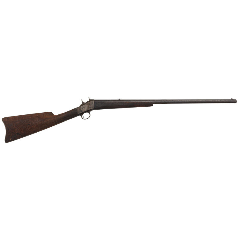 .32 Rimfire. 24" barrel length. SN: 60294. Casehardened frame and blued finish faded to deep brown patina overall mounting walnut straight wrist stock and forend. Single shot rolling block target rifle mounting dovetail mounted rear notch and front blade sights. Barrel shows REMINGTON ARMS CO. ILION, N.Y. address forward of the rear sight, and a 32 caliber marking near serial number on lower barrel. Tang appears to have been split off and brass brazed back into place with brass fill within forward tang screw. {C&R}
