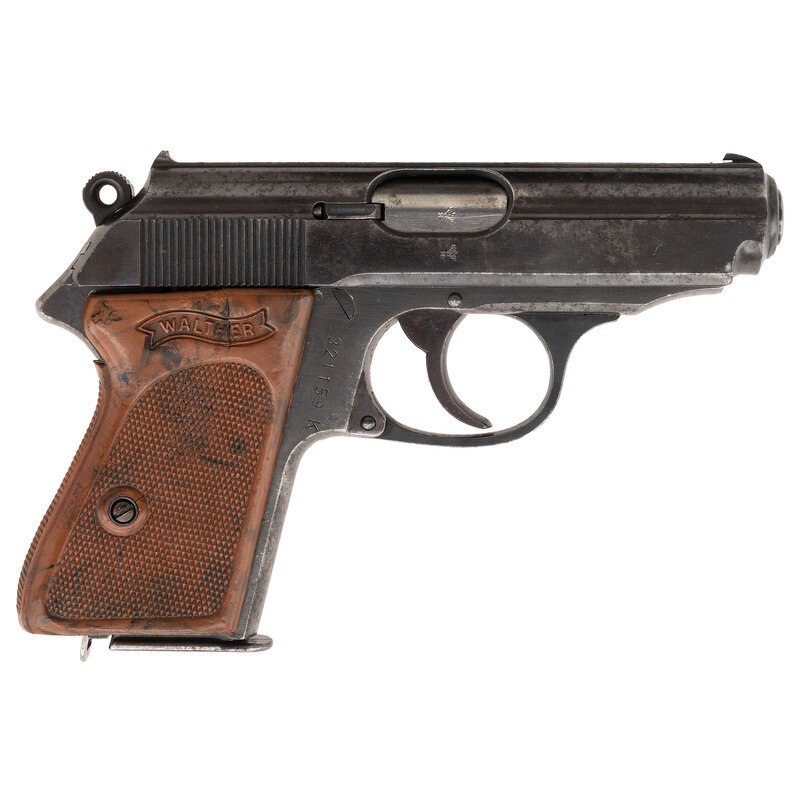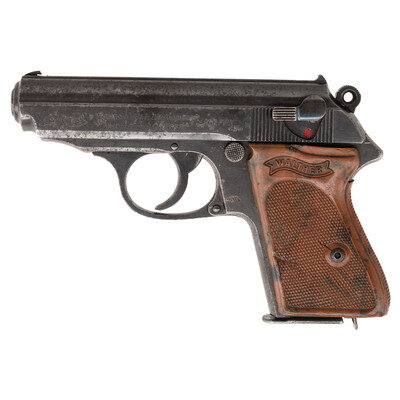 .32 ACP. 3.3" barrel length. SN: 321159K. Polished blued metal finish mounting one-piece WALTHER banner marked brown Bakelite grips with a polished chamber and fixed iron sights. DA/SA simple blowback operated autoloading pistol fed by detachable single stack magazines. Left slide struck with the WALTHER banner followed by two-line slide legend reading Waffenfabrik Walther Zella-Mehlis (Thur)/Walther's Patent Cal.7,65 m/m Mod. PPK. Item further shows the standard {Eagle/N} commercial proofs to the right slide below chamber, right muzzle, and right chamber. Left slide and frame show the {Eagle/WaA358} waffenamt marks indicating it was inspected for military service. Magazine serial number reads 218173. {C&R}