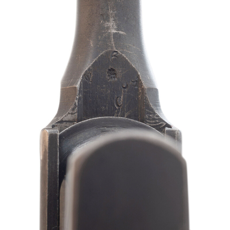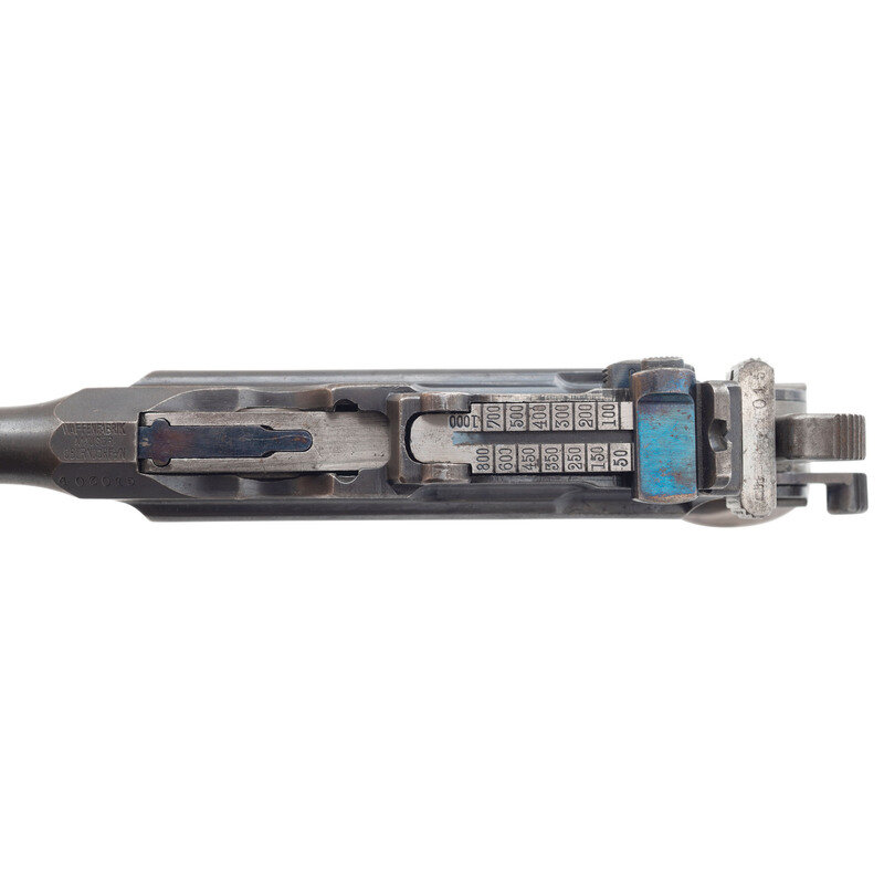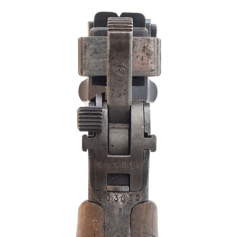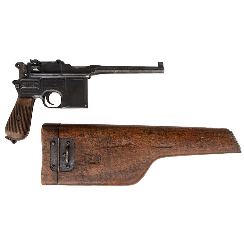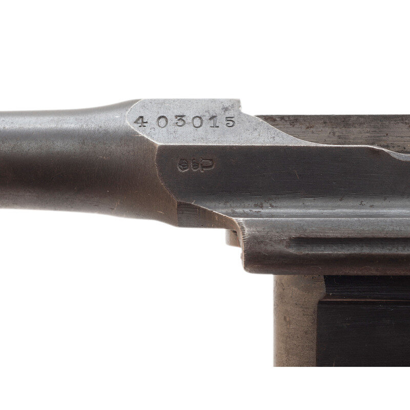 7.63x25mm. 5.5" barrel length. SN: 403015. Blued metal finish with polished bolt, Nitre blued small parts, and serrated walnut grips. Short recoil operated single action autoloading pistol fed by an internal magazine charged with stripper clips. Right receiver struck with the two line address reading WAFFENFABRIK MAUSER/OBERNDORF A NECKAR, while the upper barrel flat is marked WAFFENFABRIK/MAUSER/OBERNDORF A/N. Item shows German commercial proof marks including {Crown/U} to left slide. Right slide stamped with a {Gothic Letter} proof mark. Sights are graduated from 50 to 1000 yards. Serial numbers match where observed, including on frame, slide, bolt, lock frame, locking lug, hammer, grips, bolt stop, and magazine floorplate. Comes with a non numbered commercial stock/holster struck with the MAUSER banner mark. Interior of butt shows an incomplete name mark that has been scratched out and rendered illegible. {C&R}