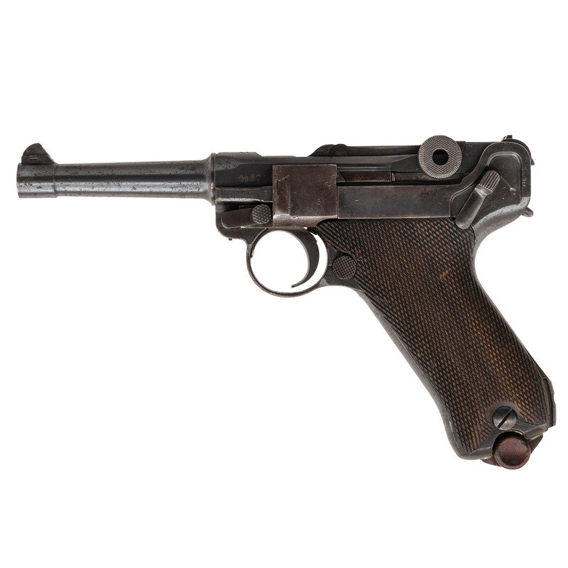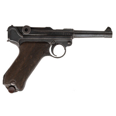 9mm Para. 3.9" barrel length. SN: 4480l. Blued metal refinish with checkered walnut grip panels and nitre blued springs. Short recoil operated toggle action autoloading pistol fed by detachable single stack magazines. Toggle link shows the standard {Crown/ERFURT} marking while the date on the barrel extension reads 1918. Item exhibits standard Imperial German army inspection marks including the {Reichsadler} stamp to left breechblock right barrel, and barrel extension. Further shows Gothic letter inspection stamps to major parts. Bore gauge reading of 8,83 to the barrel. Serial numbers match on most components, but the sideplate is not numbered and exhibits a very rough appearance suggesting it was likely rebuilt after suffering extensive pitting. The locking wedge for the takedown lever has a split seam, suggesting this part was also rebuilt. Toggle pin is replaced. Comes with one nickel plated magazine with wood baseplug showing a weak non-matching serial number. {C&R}