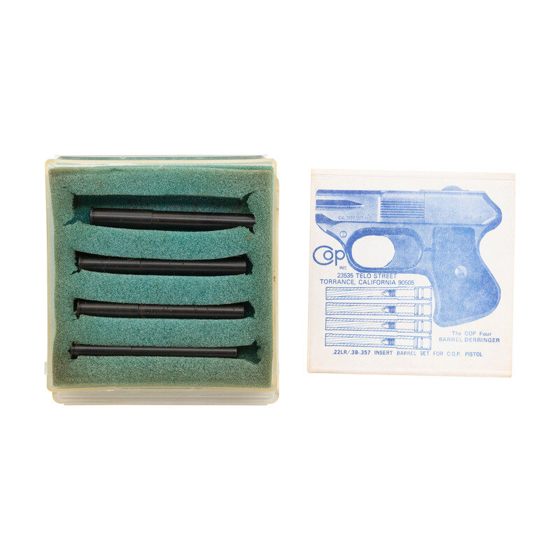 Set of four .22 caliber barrel inserts intended to convert the COP .357 Magnum pistol to .22 LR caliber. All items show a blued finish and retain rubberized breech plugs. Set comes in a clear synthetic box with a printed label reading COP INC/23535 TELO STREET/TORRANCE, CALIFORNIA 90505 with further marks including The COP Four/BARREL DERRINGER and .22LR/.38-.357 INSERT BARREL SET FOR C.O.P. PISTOL. No serial number marks.