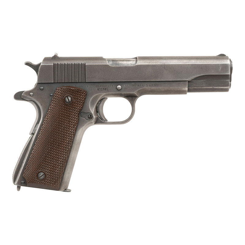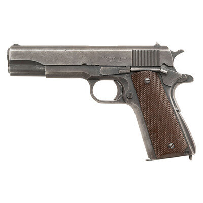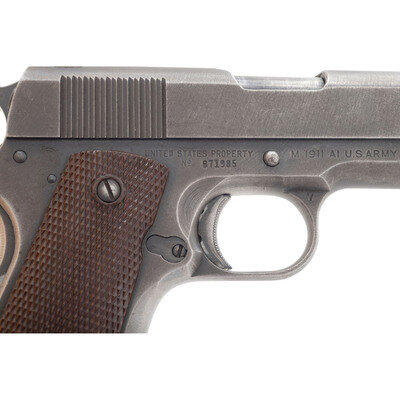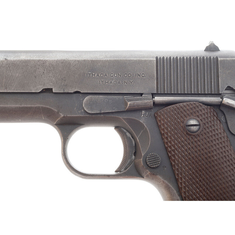 .45 ACP. 5" barrel length. SN: 871985. Parkerized metal finish mounting Keyes fibre grips, standard military pattern sights, and a blued barrel with polished chamber. Short recoil operated single action autoloading pistol fed by detachable single stack magazines. Left slide struck with two-line address marking reading ITHACA GUN CO., INC./ITHACA, N.Y.. Further slide marks include P to the top of the slide behind chamber that is struck perpendicular to the axis of the slide. An {Ordnance Bomb} is marked on the rear face of the slide beneath the firing pin plate. A second {Ordnance bomb} appears on the interior of the dustcover on the frame. Left frame stamped with the FJA initials of inspector Frank J. Atwood with a P below the magazine release. Right frame stamped UNITED STATES PROPERTY above the serial number followed by model marking M 1911 A1 U.S. ARMY. An {Ordnance Wheel} is weakly struck into the right frame. Barrel stamped with P to left lug and HS on the right, indicating it was made for Ithaca by High Standard. The serial number on the frame falls in the correct range for an Ithaca, and correctly lacks the proof marks that began to appear after serial number 900,000. Right triggerguard marked 7. Both grip panels show the {K in Star} logo of the Keyes company. Magazine is blued and unmarked. Item retains a rough external machined finish to the metal. {C&R}