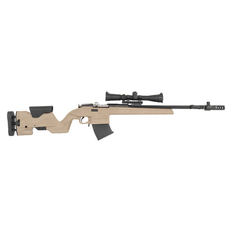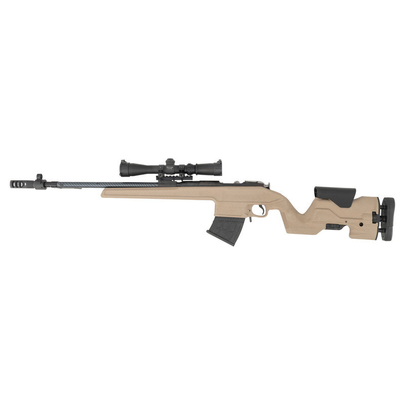 7.62x54mmR. 20.2" barrel length. SN: T53017678 (Original Chinese Number: 3243864). Blued metal finish with polished bolt and carbon fiber wrapped barrel mounted in an FDE synthetic ARCHANGEL pattern stock with adjustable cheek riser and length of pull. Bolt action detachable magazine fed repeating custom rifle built on a Chinese Type 53 Mosin-Nagant carbine. Item retains the original cruciform side folding bayonet and post and globe front sight. Rear sight has been removed and the block used to mount a picatinny rail and Hi-Lux 2-7x32 telescopic sight. Standard original Chinese markings to the receiver including Factory 26 mark. Mounts a clamp-on style muzzle brake secured by two Allen screws. {MODERN}
