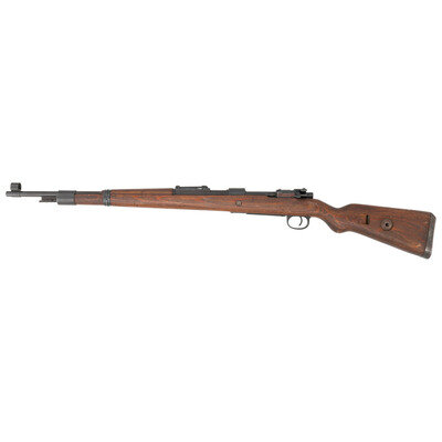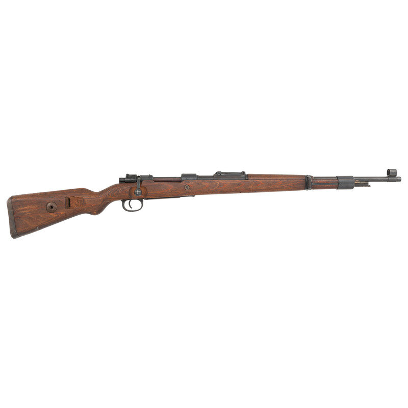 7.92x57mm. 23.62" barrel length. SN: 2918. Blued metal finish set in wood semi-pistol grip stock and mounting adjustable tangent rear notch and inverted-V front blade sights. Bolt-action internal magazine fed repeating rifle charged with stripper clips. Top of receiver has been struck with the dot manufacturer code representing Waffenwerke Bruenn AG, Brno, Czechoslovakia, date marking of 1944, and Mod. 98 model marking. Right side of receiver is struck with two {Eagle/63} waffenamt markings, with one on left side of barrel behind serial number, and two {WW2 German Eagle} stamps. Bolt features matching serial number to receiver, but different waffenamt mark struck {Eagle 67}. {C&R}