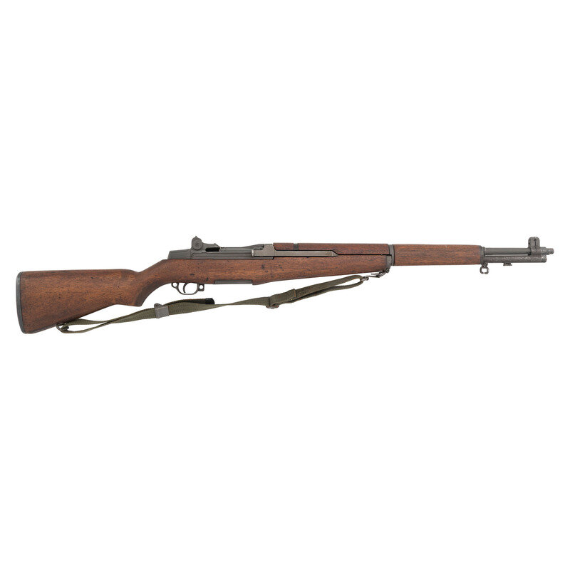 .30-06. 24" barrel length. SN: 911577. (Receiver dated October 1942) Parkerized arsenal refinish overall mounting oil finished walnut semi-pistol grip stock with full length upper handguard. Long stroke piston driven semi-automatic rifle charged with en bloc clips. Receiver serial number corresponds to October, 1942 production. Item was rebarreled with the current barrel date reading 10 64, for October, of 1964. The top of the bolt is punch dot marked, and the barrel shows a P proof and {Defense Acceptance Stamp}. Item additionally features the radius cut operating rod, and T105 pattern rear aperture sight. Comes with canvas Nobuckl pattern sling. {C&R}
