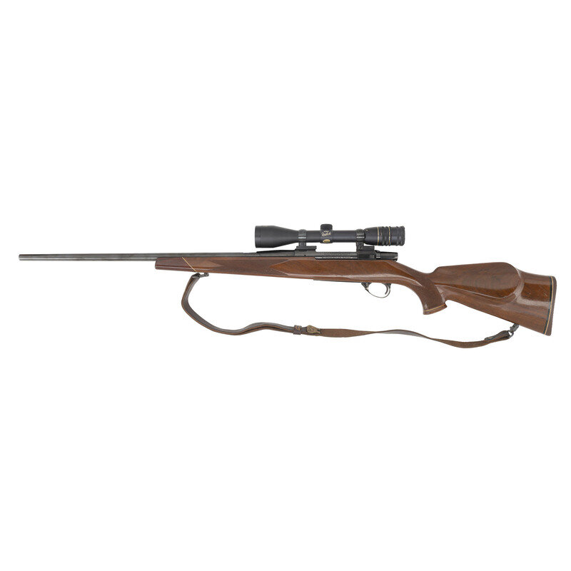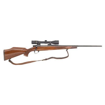 .30-06. 25" barrel length. SN: 01341. Bolt action rifle with semi pistol grip stock and internal magazine. Blued finish on frame and barrel with polished bolt and wood stock. Frame features standard Weatherby markings. Stock features white spacers on front, rear, and at bottom of pistol grip, with a white diamond on base of pistol grip. GRE/143 54/7358 engraved on floor plate in front of magazine. Fitted with Weatherby Premier 3x-9x40 scope and sling. {MODERN}