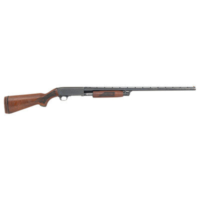 12 Gauge. 30" barrel length. SN: 371558052. 2.75" chamber length. Full Choke. Blued metal finish with polished bolt mounting walnut semi-pistol grip stock with pressed checkering to wrist and forend, an ITHACA marked semi-pistol grip cap, and a replaced and roughly fitted recoil pad. Slide action repeating shotgun mounting a full length vented barrel rib mounting a synthetic red front bead sight. Standard make and model markings including lightly engraved receiver with bird scenes to both flanks. {C&R}