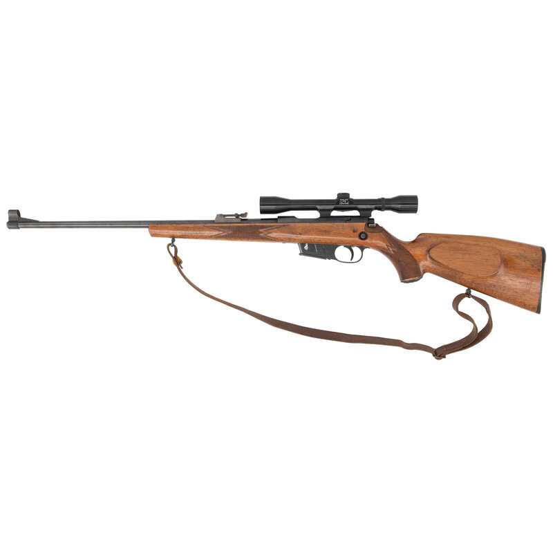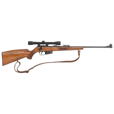 .22 Hornet. 22" barrel length. SN: 105434. Blued metal finish with polished bolt mounting walnut semi-pistol grip stock with cheek rest, and bordered checkering. Bolt action semi-detachable magazine fed repeating rifle mounting a Weatherby MARK XXII/4X50 telescopic sight to dovetailed rail. Item mounts adjustable tangent rear notch and fully hooded front blade sights. Standard make and model markings. Comes with leather sling. {C&R}