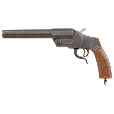 26.5mm. 9" barrel length. SN: 52927. Blued metal finish with polished hammer and trigger with two piece smooth walnut grips and featuring a lanyard loop to the butt. Single shot break action signal flare pistol with octagonal to round barrel. Left frame struck with circle M marking while the right frame and barrel display Imperial German firing proofs including {Crown/B}, {Crown/U}, and {Crown/A} marks. Barrel additionally struck {Crown/S}, and shows the {Reichsadler} mark.