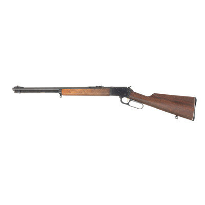 .22 S/L/LR. 20" barrel length. SN: Z20043. Blued metal finish with polished receiver flanks and matte finished edges mounting walnut straight wrist stock with white line spacers to black synthetic Marlin marked buttplate. Lever action repeating takedown rifle fed by a frontally charged magazine tube. Standard make and model markings, and a gold trigger. Item mounts sling loops to forend and toe. {C&R}