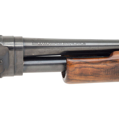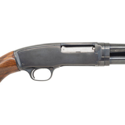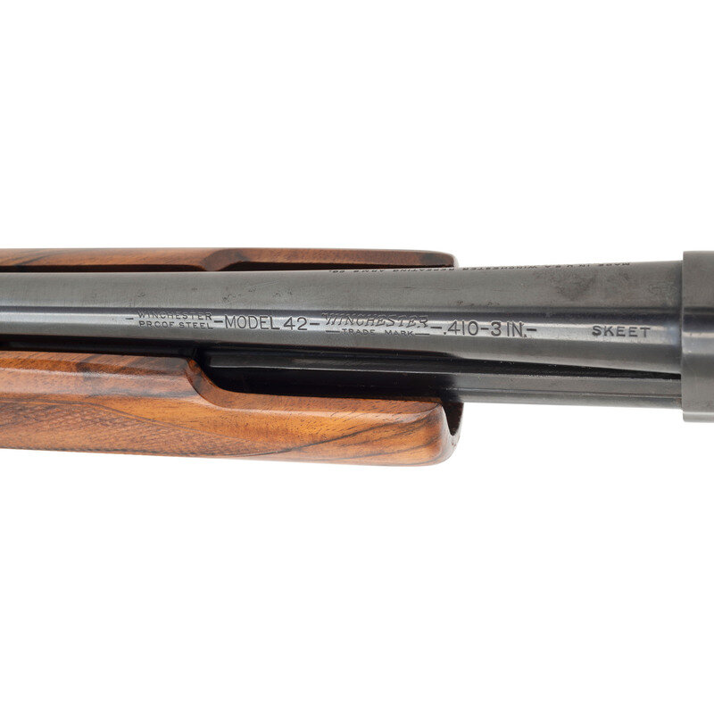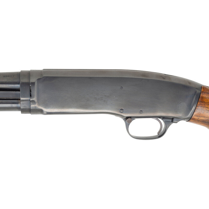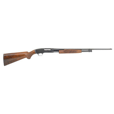 .410 Gauge. 26" barrel length. SN: 13240. 3" chamber length. Improved Cylinder. Blued metal refinish overall mounting deluxe grade replaced semi pistol grip stock and forend with bordered checkering. Slide action repeating shotgun fed by a tube magazine and mounting white front bead sight. Item shows standard manufacturer markings including the SKEET mark to left barrel. Bolt has been polished. Action lock is stiff and may need repair. {C&R}