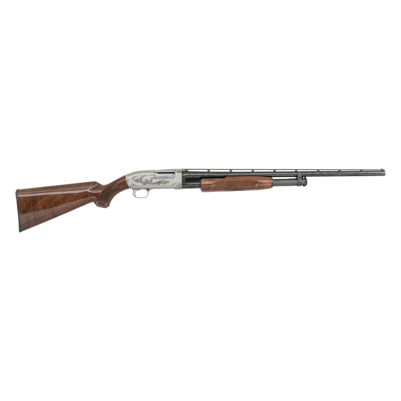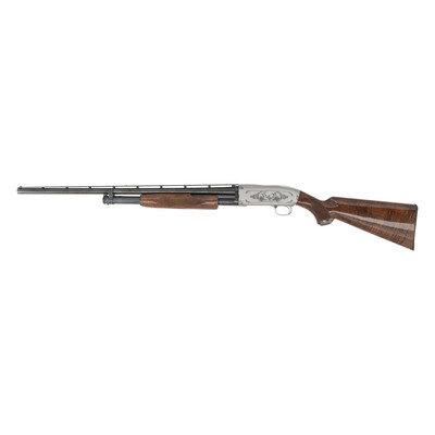 20 Gauge. 26" barrel length. SN: 93DU4209. 2.75" chamber length. Improved Cylinder choke. Blued metal finish with buffed bright receiver and bolt mounting deluxe polished walnut semi pistol grip stock and forend with bordered multipoint checkering. Slide action repeating shotgun mounting a factory full length vented barrel rib with twin bead sights, and fed by a tube magazine. Receiver is laser engraved with DUCKS UNLIMITED banners to both sides and includes three ducks in flight to left receiver and a retriever on the right. Winchester monogram proofs are offset for rib. Right barrel struck MADE IN JAPAN. {MODERN}