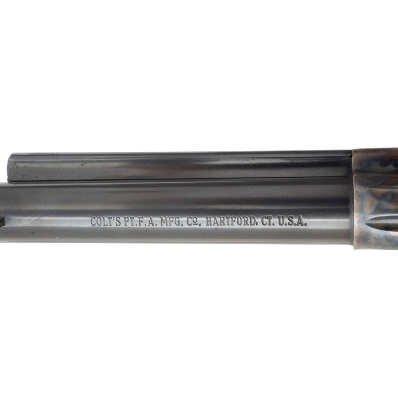 .45 Long Colt. 5.5" barrel length. SN: SA11153. Blued metal finish with casehardened frame and polished hammer flanks mounting checkered black synthetic Rampant Colt logo and Eagle grips. Single action six shot loading gate revolver mounting topstrap notch and fixed front blade sights, and featuring a spring loaded ejector. Standard make and model markings including the three patents in two lines on left frame followed by {Rampant Colt}, and Colt's VP proof to left triggerguard. {MODERN}