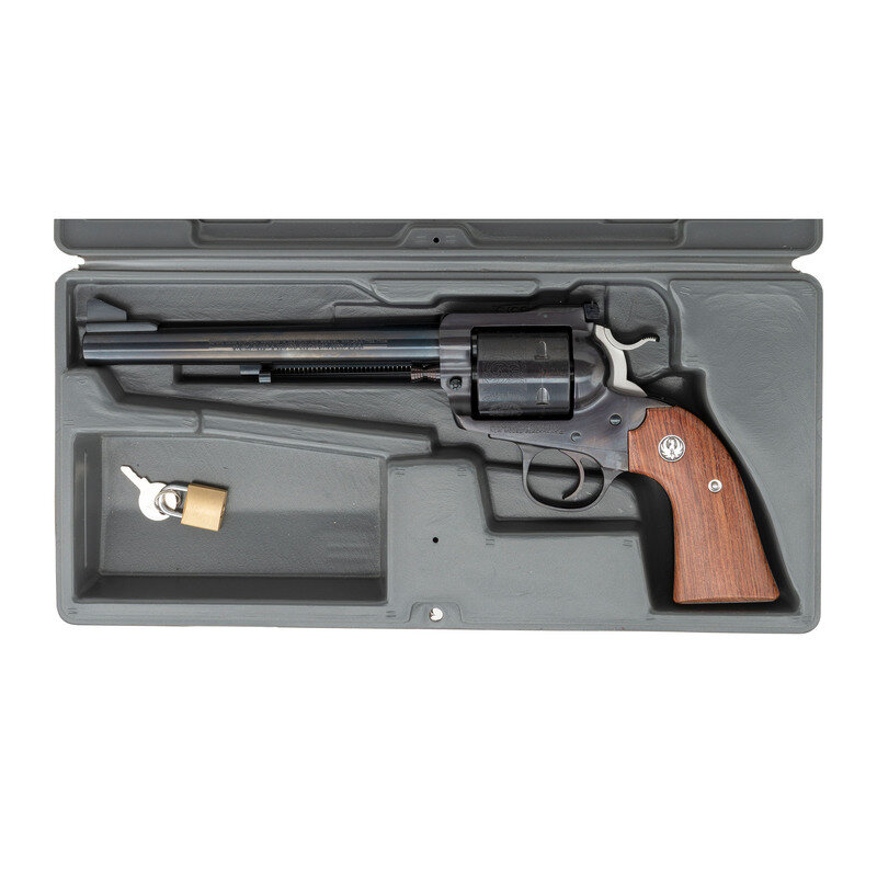 .45 Long Colt. 7.5" barrel length. SN: 47-87951. Blued metal finish overall with polished hammer flanks mounting wood Ruger medallion grips, and adjustable target rear notch and matted front ramp sights. Single action six shot loading gate revolver with spring loaded ejector rod. Cylinder is laser engraved with a floral banner enclosing RUGER BISLEY MODEL marking. Standard make and model markings including two-line warning and STURM, RUGER address to left barrel. Comes with original gray synthetic hard case with owner's manual. {MODERN}