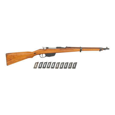 8x56mmR. 19.7" barrel length. SN: 3779D. (Importer assigned M953403694) Blued metal arsenal refinish overall with polished bolt mounting varnished wood semi-pistol grip stock with full length upper handguard. Straight pull bolt-action repeating rifle charged with en bloc clips and mounting adjustable ladder rear notch and front blade sights. Original markings include STEYR stamp to receiver over M.95 model mark, and preceded by the Austrian {Eagle} stamp. Importer marks for C.A.I. on left receiver. Serial numbers match on receiver, barrel, right butt, and bolt, the latter marked with electropen. Comes with ten en bloc clips. {C&R}