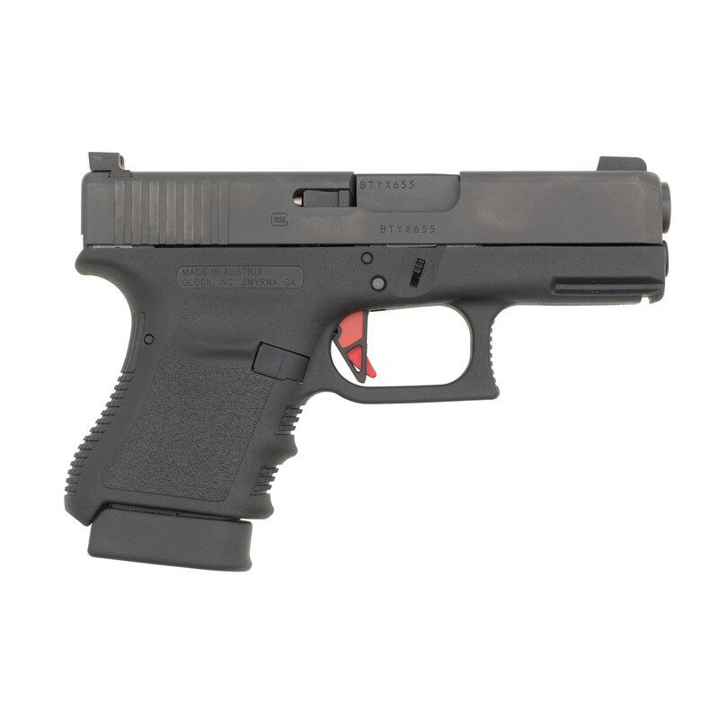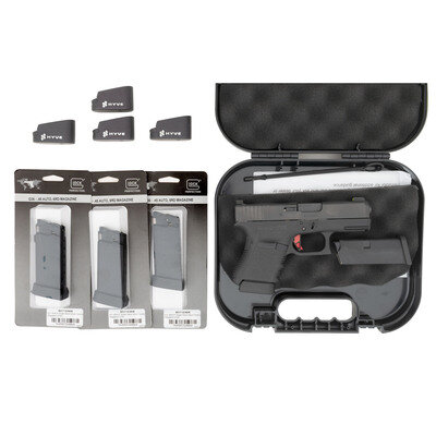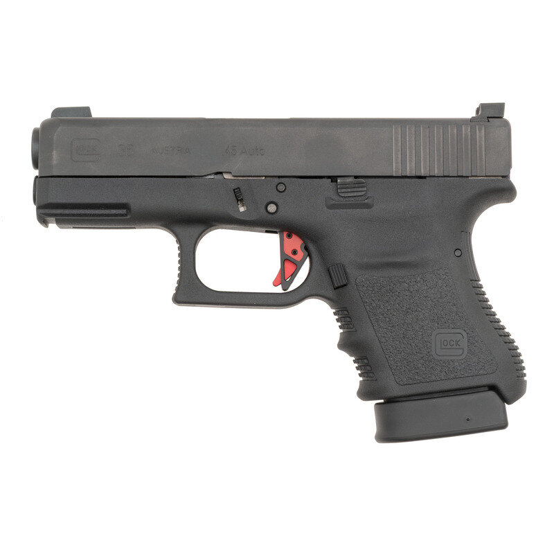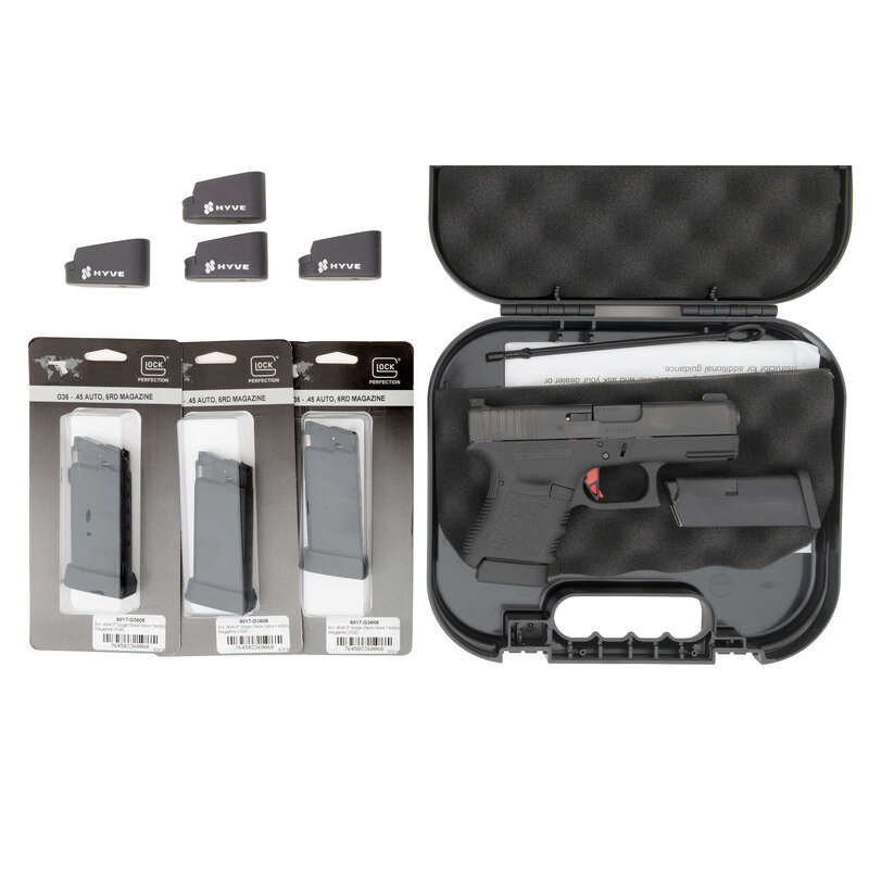 .45 ACP. 3.78" barrel. SN: BTYX655. Blackened finish, polymer frame. Safe action striker fired removable magazine fed semiautomatic pistol. Standard Glock markings and Gen 3 style features including finger groove grip. Upgrades include a Glock Store Flat Face Red Pyramid Trigger and high visibility 3-dot night sights with a Day-Glo yellow insert around the front sight dot. As new in original factory box with all Glock factory paperwork, cleaning accessories and cable lock. Includes a total of 5 magazines, 3 of which are still in their factory packaging and 4 Hyve Technology +1 base extensions for Glock 36 magazines. {MODERN}