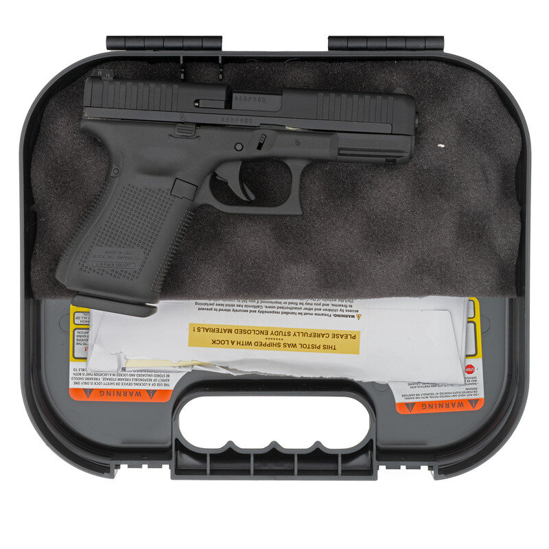 .22LR. 4.02" barrel. SN: AEBP980. Blackened finish, polymer frame. Safe action striker fired removable magazine fed semiautomatic pistol with adjustable white U outline rear sight and white dot front sight. Standard Glock markings. In original factory box with factory paper work, cable lock, replaceable backstraps and a total of 2 magazines. {MODERN}