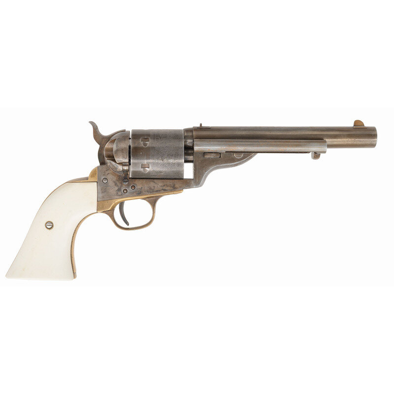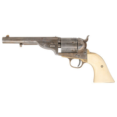 .38 Special. 6" barrel length. SN: X01898. Blued finish with casehardened frame and brass gripstraps mounting white synthetic grips. Single action six-shot loading gate revolver based upon the Richards-Mason converted Model 1860 Army with spring-loaded ejector rod, and dovetail front blade and rear notch sights, the latter mounted to the barrel beside the address. Item shows Ormsby's Naval Engagement scene on the cylinder with Italian smokeless powder firing proofs to major parts. Finish has been artificially aged and now shows a pewter gray color to blued parts and subdued case colors. {MODERN}