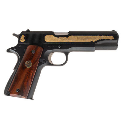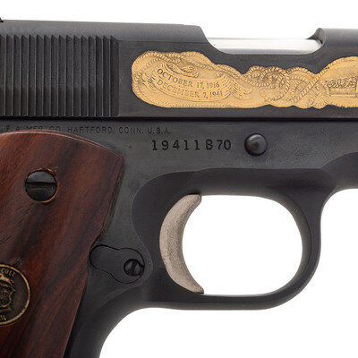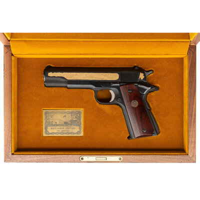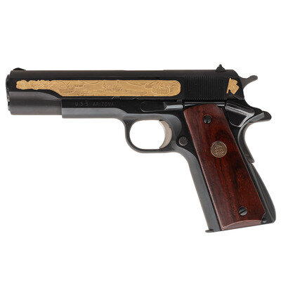 .45 ACP. 5" barrel length. SN: 19411B70. Parkerized finish with wood grips. Single action recoil operated semi auto pistol with government sights. Scene of USS Arizona on left side of slide with BATTLESHIP EDITION 1 of 500. Scene of USS Arizona Pearl Harbor memorial inlaid on right side of slide with OCTOBER 16, 1916/DECEMBER 7,1941. {MODERN}