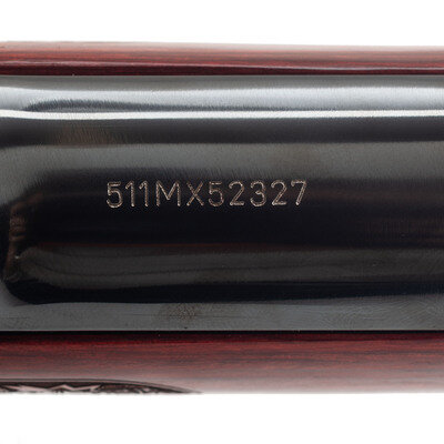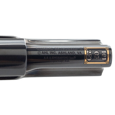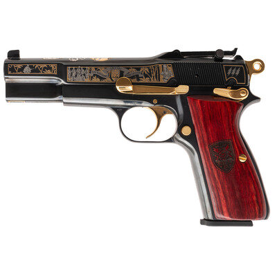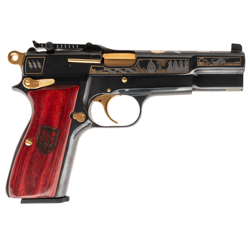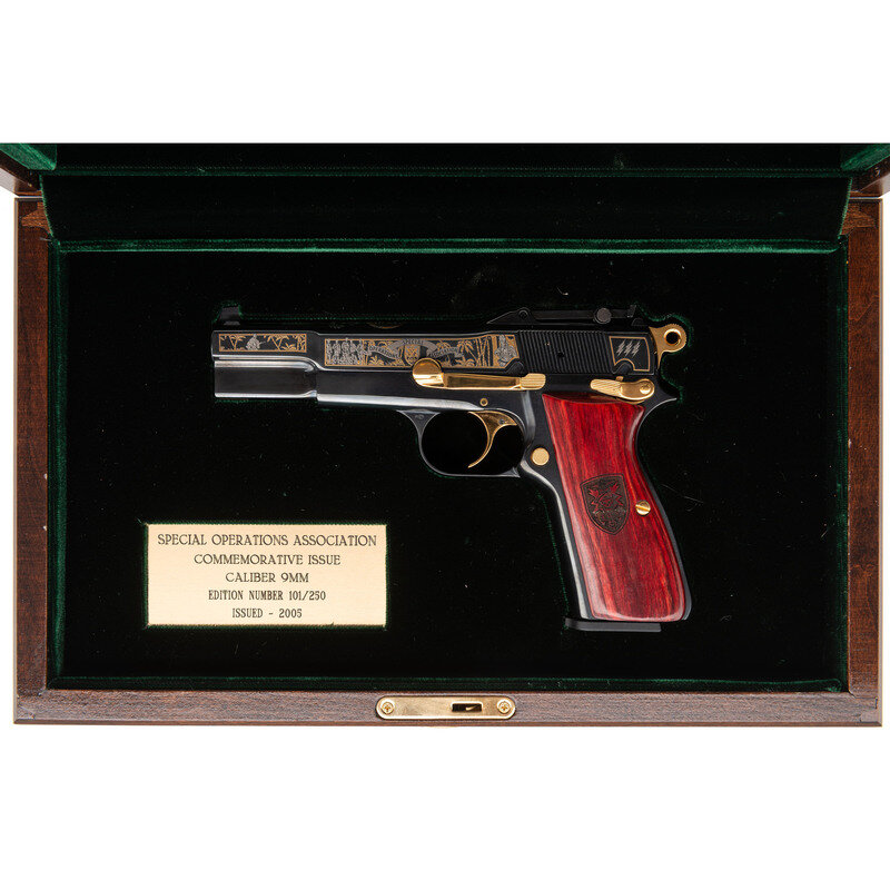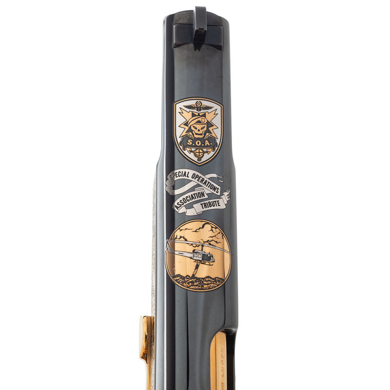 9mm. 4.75" barrel length. SN: 511MX52327. Polished blued finish with polished wood grips and gold plated small parts. Single action recoil operated semi auto pistol with government sights. Slide features gold inlaid scene of US soldiers. Left side of slide features text reading SPECIAL OPERATIOSN ASSOCIATION and right side features text reading VIETNAM LAOS CAMBODIA. Top of slide near muzzle features SOA emblem with SPECIAL OPERATIONS ASSOCIATION TRIBUTE and medallion featuring a helicopter beneath. Wood grips are engraved with SOA emblem. 101 of 300 engraved below muzzle. Comes with display case. {MODERN}