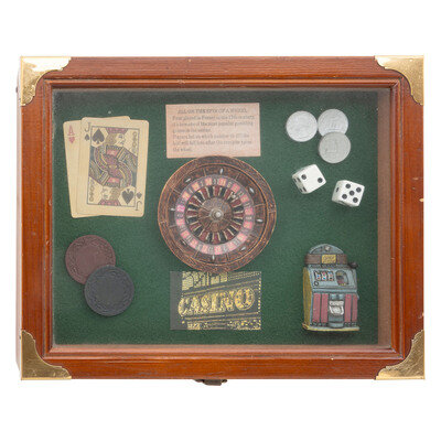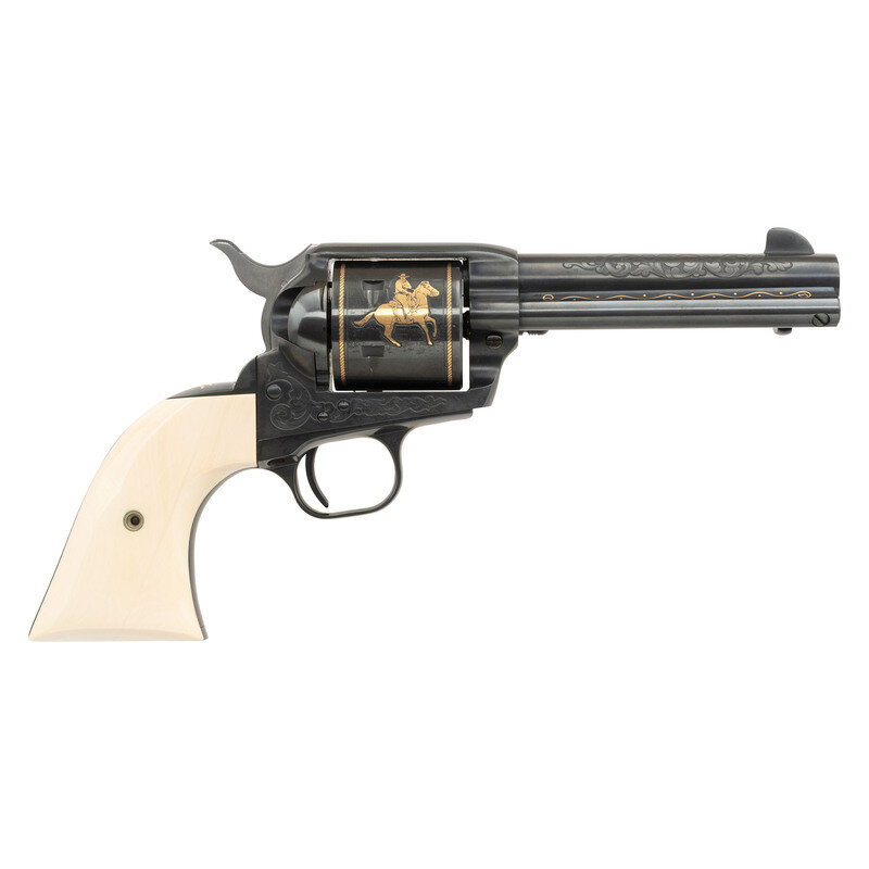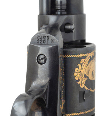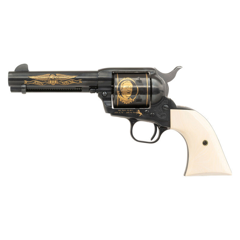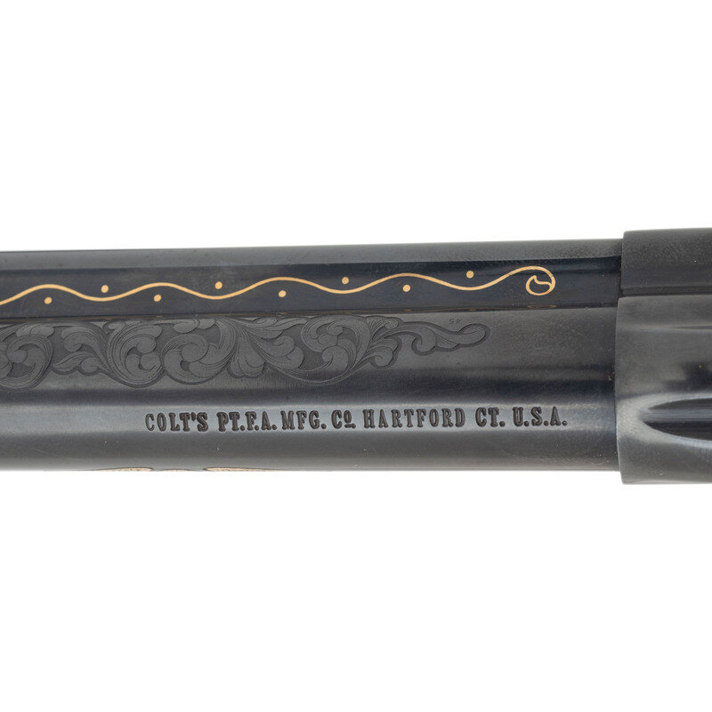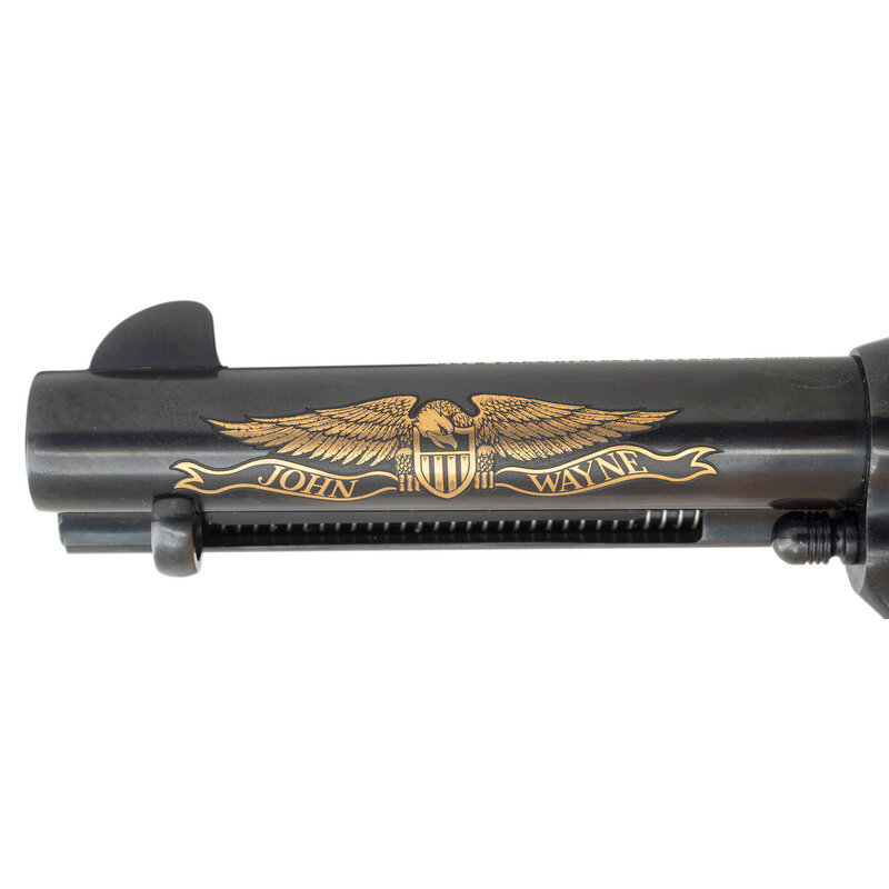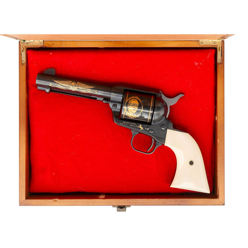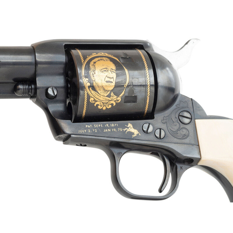 .45 Long Colt. 4.75" barrel length. SN: CJWC2201. Blued metal finish with polished hammer flanks mounting ivory grip panels and featuring engraved details, and gold inlaid designs commemorating the life of legendary Western movie star John Wayne. Markings include gold inlaid three patents in two lines on left frame followed by a gold {Rampant Colt} logo. Further shows Colt's VP mark on the triggerguard and single line address to the top of the barrel. Frame flanks and right barrel laser engraved with floral scroll. Cylinder is engraved and gold inlaid with rope borders enclosing a portrait of John Wayne to the left side, and John Wayne on horseback to the right. Backstrap inlaid with a gold D over two lines. Comes with a wood presentation case with playing cards, chips, a jukebox, and miniature roulette wheel. {MODERN}