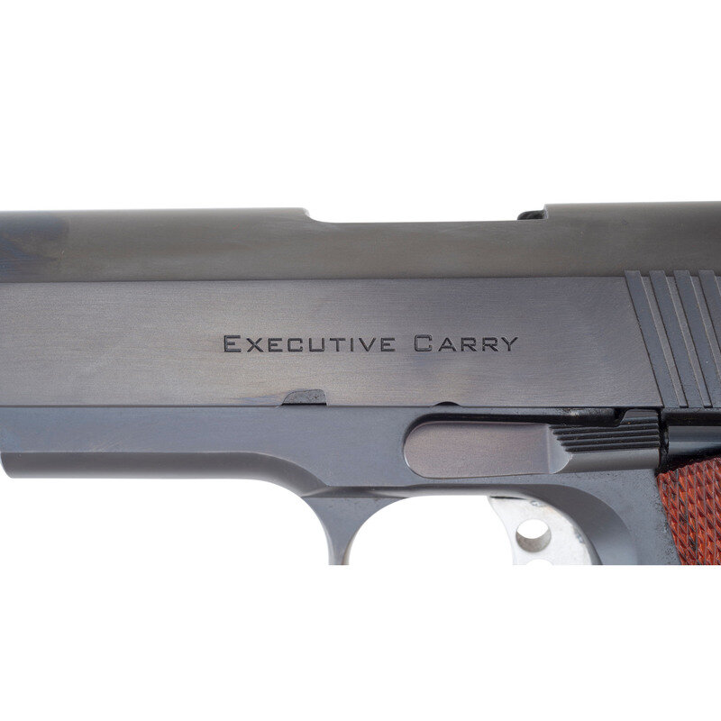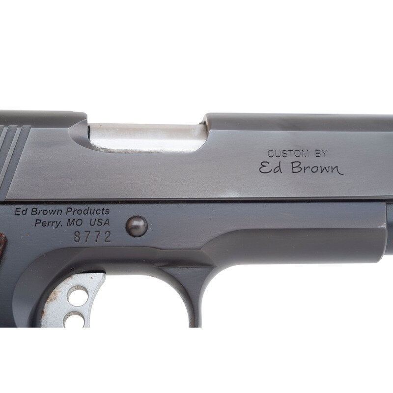 .45ACP. 4.25" barrel. SN: 8772. Blued finish, aluminum trigger, double diamond checkered figured Cocobolo grips. Single action, removable magazine fed Browning designed short recoil tilting barrel semi-automatic handgun. Reverse of slide marked EXECUTIVE CARRY, obverse marked CUSTOM BY/ED BROWN. Obverse frame marked Ed Brown Products/Perry, MO USA over the serial number. This high quality "Commander" sized 1911 from Ed Brown features excellent workmanship, the Ed Brown "Bob Tail" reduced profile mainspring housing, the Ed Brown "Memory Groove" grip safety, a skeletonized Commander hammer, extended thumb safety, three-hole aluminum adjustable match trigger, match grade barrel, Trijicon low-mount Novak style white outline three dot night sights, a lowered and flared ejection port, a checkered frontstrap and checkered mainspring housing. The pistol is accompanied by a total of three Wilson Combat 8-round magazines and a Galco Combat Master holster for a 5" 1911. Current MSRP for this pistol is $3,195. {MODERN}