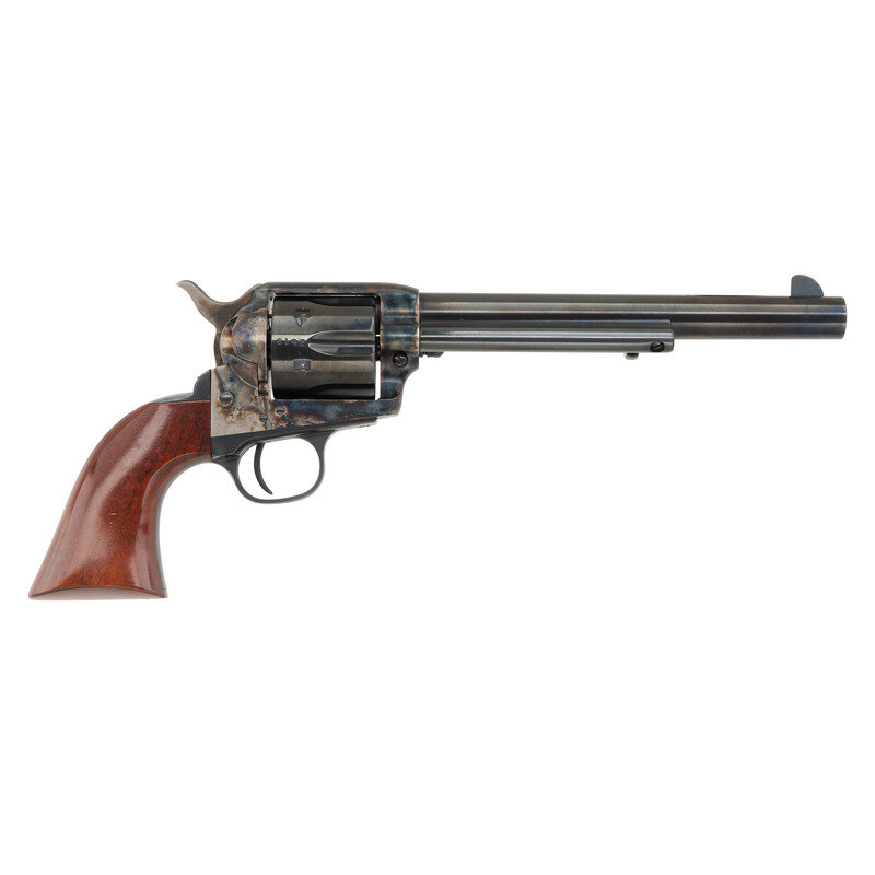 .45 Colt. 7.5" barrel. SN: UE2619. Blued metal finish with case colored frame and hammer mounting polished one piece wood grips. Single action six-shot loading gate revolver mounting fixed topstrap rear notch and front blade sights. Standard Italian black powder firing proofs and manufacturer markings. Action features a lightened mainspring. {MODERN}