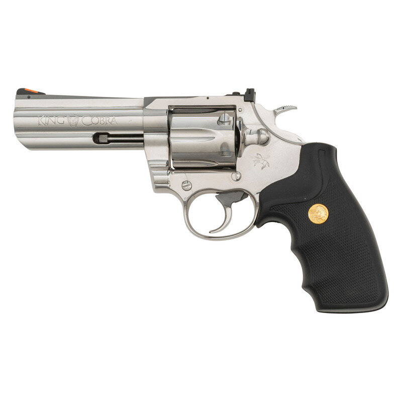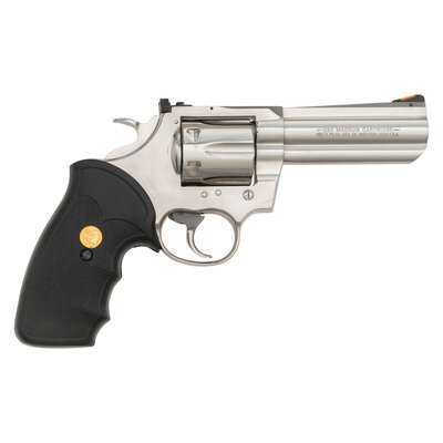 .357 Magnum. 4" ribbed barrel. SN: KK1189. Stainless steel finish, matted stop strap, checkered rubber finger groove grips with gold Rampant Colt medallions. Double action revolver with 6-chambered swing-out cylinder, white outline adjustable target rear sight and orange insert ramp front sight. {MODERN}