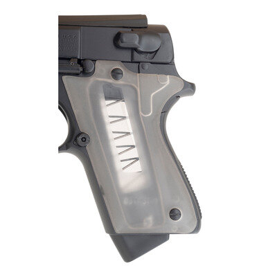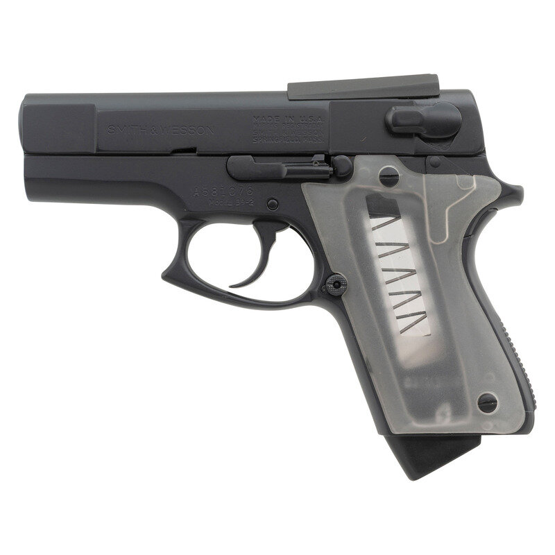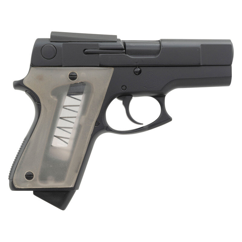 9mm. 3.25" barrel. SN: A581076. Blackened finish, smooth clear Lexan grips to allow cartridge counting. Conventional double action tilting barrel semi-automatic handgun with removable magazine, modified for discreet concealed carry. Original Smith & Wesson markings mostly intact, although part of the four-line patent and address information on the left of the slide is machined away where the serrations were removed. The ASP was one of the first purpose designed concealed carry or backup duty pistols in a real duty caliber to be introduced to the firearms market. Using a Smith & Wesson Model 39 as the base pistol, the modifications to the gun were designed by Paris Theodore of Seventrees Custom Gun Leather and Armament Systems & Procedures, INC, thus the sobriquet "ASP". Theodore had a reputation of being sort of a real life "Q" as in the James Bond books and films and designed and built a variety of items intended for use in spy craft. Some of the primary modifications to the stock guns included shortening the barrel and slide, using a fixed barrel bushing, the addition of the unique "Guttersnipe" rear sight, the elimination of the front sight and bobbing the hammer. Additional improvements included de-horning the gun to remove the sharp edges and even the cocking serrations on the slide. He also installed clear Lexan grips that allowed the cartridges in the special cut-away magazine to be seen and counted. Another feature was the modification of the triggerguard to a hooked profile to provide a purchase for the off-hand index finger when supporting the pistol. Many of these design innovations were subsequently included in other Smith & Wesson handguns and are commonly encountered on current production firearms today. Theodore produced these guns from the 1970s through 1982 when ASP Corporation of Appleton, WI was licensed to produce the design. This appears to be one of the original Paris Theodore ASP pistols and includes a single original magazine. A rare opportunity to own one of the original compact concealed carry pistols that helped to inspire an entire segment of the modern firearms industry and was famous enough in its day to make appearances in James Bond novels. {MODERN}