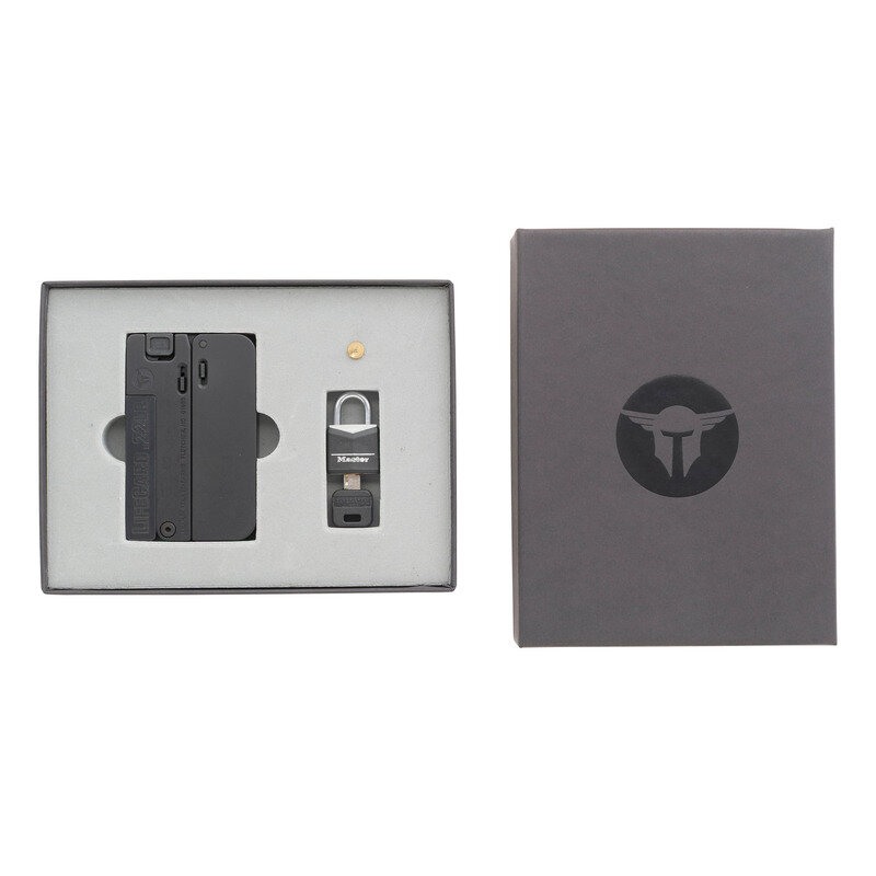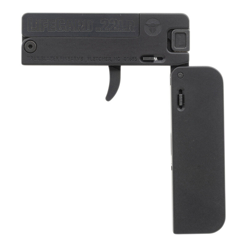 .22 LR. 2.5" barrel length. SN: 01685. Black Oxide finish overall with gutter sight and folding grip. Single shot tip-up pistol designed to fold over with similar profile to a credit card. Left frame struck with maker marking TRAILBLAZER FIREARMS FLETCHER, NC, while the left barrel is marked LIFECARD .22LR. Item comes in its original cardboard box with a fired casing, owner's manual, warranty card, and padlock with key. {MODERN}