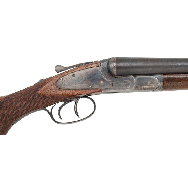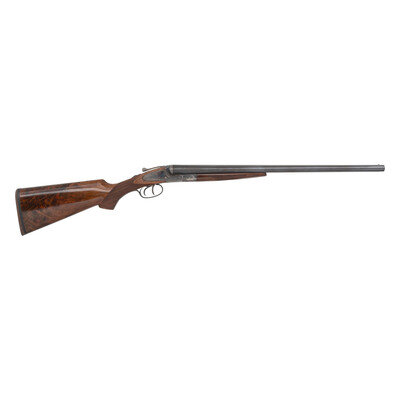12 Gauge. 23.625" barrel length. SN: 25768. 2.75" chamber length. Cylinder chokes. Blued refinish with case colored frame mounting refitted walnut semi-pistol grip stock with splinter forend showing high figure to butt, and multipoint checkering to handling surfaces. Double barrel side by side sidelock extractor shotgun with single brass bead sight on a matted barrel rib. Sideplates show maker marking L.C. SMITH with FIELD grad marks to barrel flats and watertables. Both barrels struck ARMOR STEEL with right marked L.C. SMITH Field GRADE and the left HUNTER ARMS CO. INC. MFRS FULTON, NY, U.S.A. Item mounts a decelerator recoil pad, and a tang safety. Barrels have been cut down with a new plug installed between them at muzzle. Locking lever fits with substantial space over the tang, possibly replaced. {C&R}