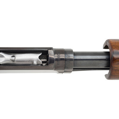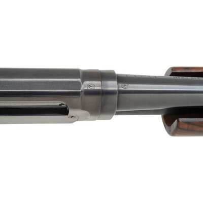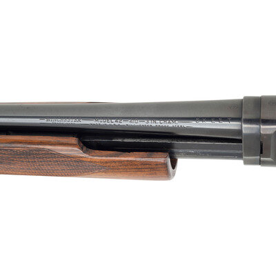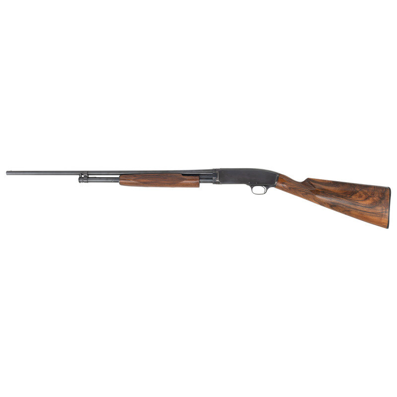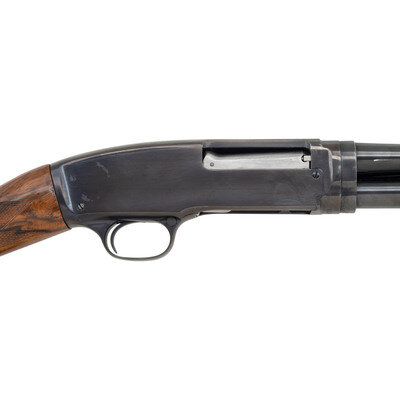 .410 Gauge. 26" barrel length. SN: 108966. 3" chamber length. Modified Cylinder. Blued metal refinish mounting replaced deluxe grade straight stock featuring diamond checkering on wrist and forend. Slide action repeating shotgun fed by a tube magazine mounting bead front sight. Standard make and model markings on receiver and barrel with SKEET on lefthand side of barrel near receiver. {C&R}