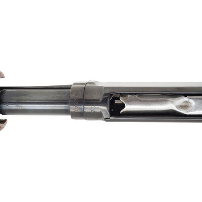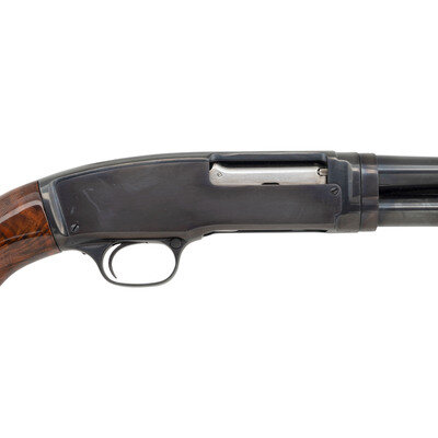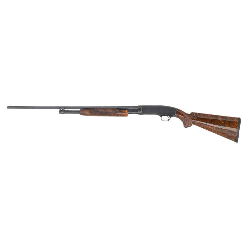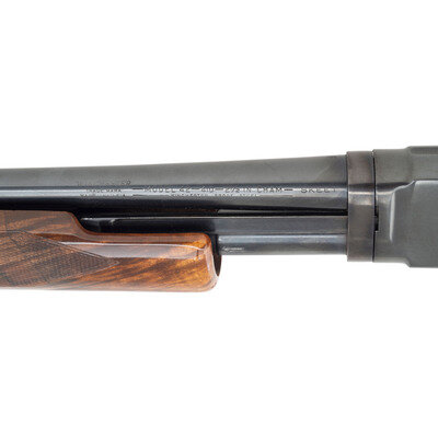 .410 Gauge. 26" barrel length. SN: 7525. 3" chamber length. Improved Modified cylinder. Blued metal refinish mounting replaced deluxe grade semi pistol grip stock and forend featuring bordered checkering on wrist and forend. Slide action repeating shotgun fed by tube magazine. Standard make and model markings. {C&R}