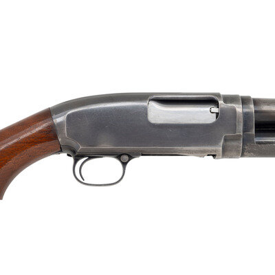 16 Gauge. 28" barrel length. SN: 824492. 2.75" chamber length. Cylinder Bore. Blued metal finish with polished bolt mounting walnut semi-pistol grip stock with black synthetic butt and corncob pump handle. Slide-action tube magazine fed shotgun with front bead sight. Standard make and model marks include two-line address and patent marks to right barrel and WINCHESTER PROOF STEEL to left followed by model and caliber information. Barrel and receiver exhibit standard Winchester monogram proofs. MOD. choke marking indicates the shotgun left the factory with a Modified choke. {C&R}
