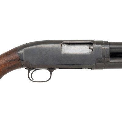16 Gauge. 28.25" barrel length. SN: 1310117. 2.75" chamber length. Adjustable POLYCHOKE. Blued metal finish with polished bolt mounting walnut semi pistol grip stock with corncob forend and a WINCHESTER marked black synthetic buttplate. Front sight bead mounted on the polychoke. Standard make and model markings including two-line address and WINCHESTER PROOF STEEL to left barrel followed by model information. IMP. CYL. choke mark to left barrel suggests the Polychoke was installed after production. Winchester monogram proofs to barrel and receiver. {C&R}