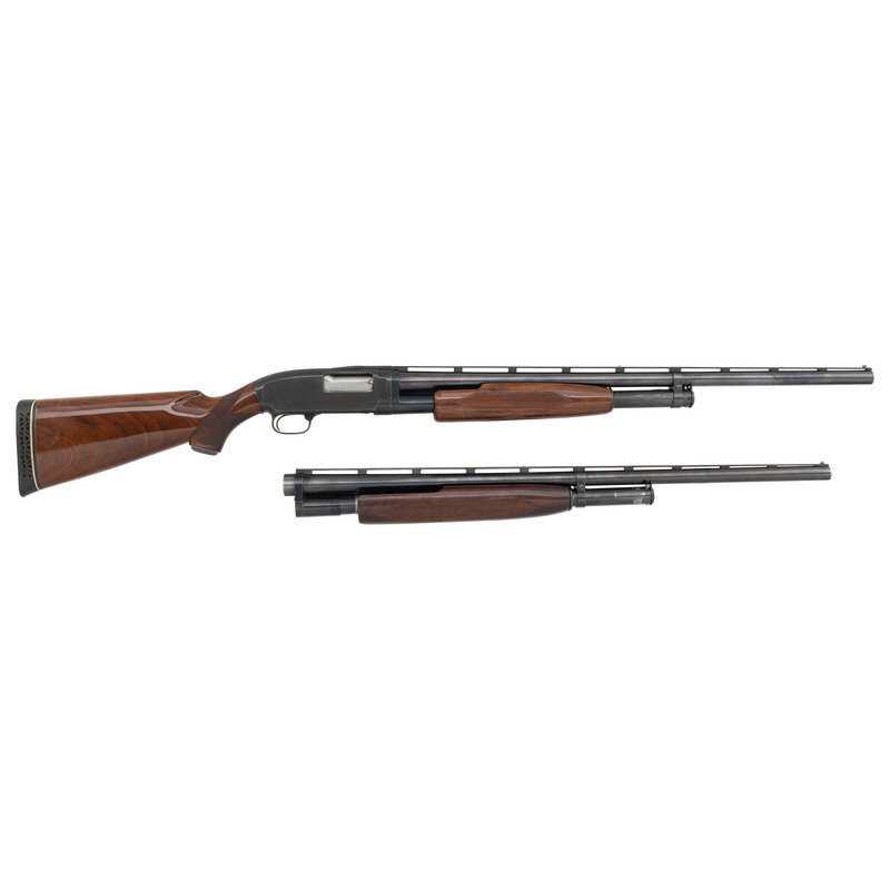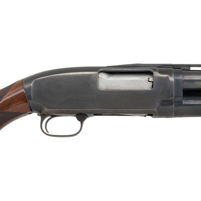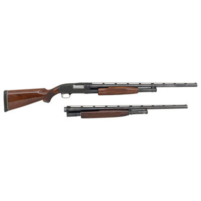 12 Gauge. 27" barrel length. SN: 560080. 2.75" chamber length. 12 Gauge Full Choke. Overbore 10 Gauge Modified. Blued metal refinish overall with polished bolt mounting polished walnut semi-pistol grip stock with bordered checkering to wrist and forend. Slide action repeating shotgun fed by a tube magazine mounting factory vented barrel ribs and twin bead sights. Standard marks include three line trade mark to left barrel with one barrel showing WS-1 mark and the other a FULL choke marking. Mounts a factory rib with offset proofs. Spare barrel measures 29.75" in length. {C&R}