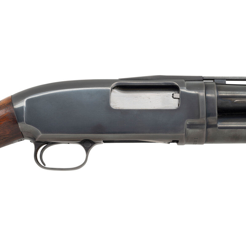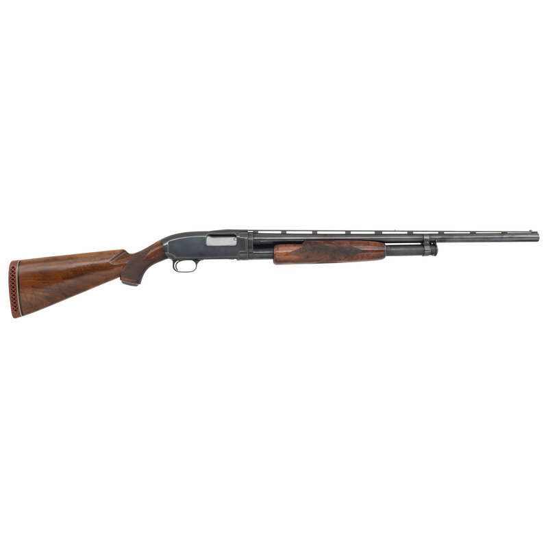 12 Gauge. 26" barrel length. SN: 1925144. 2.75" chamber length. Modified Cylinder. Blued metal refinish and polished bolt mounting replaced deluxe grade pistol grip stock featuring bordered diamond checkering on wrist and forend. Slide action shotgun fed by tubular magazine mounting factory rib with twin beaded sights. Standard make and model markings with offset rollmark on barrel and receiver. Features Winchester rubber recoil pad fitted to stock.