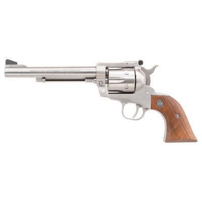 .357 Magnum. 6.5" barrel length. SN: 36-46130. Brushed stainless steel finish overall mounting Ruger medallion wood grips with flat top frame mounting adjustable target rear notch sight paired with a pinned matted front ramp. Single action six-shot loading gate revolver with transfer bar safety mechanism. Standard make and model marks. Front sight blade has been painted with red enamel to increase visibility.